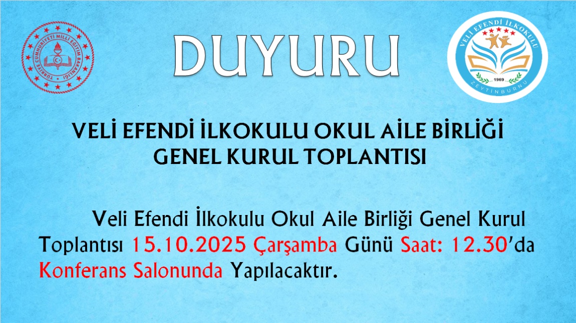 Veli Efendi İlkokulu Okul Aile Birliği Genel Kurul Toplantısı 15.10.2025 Çarşamba Günü Saat: 12.30’da Konferans Salonunda Yapılacaktır.